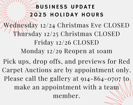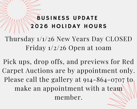 Pick ups, drop offs, and previews for Red Carpet Auctions are by appointment only. Please call the gallery at 914-864-0707 to make an appointment for pick up.