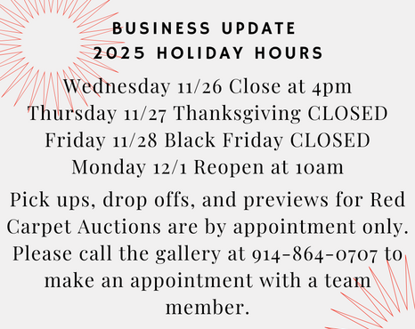 Pick ups, drop offs, and previews for Red Carpet Auctions are by appointment only. Please call the gallery at 914-864-0707 to make an appointment for pick up.